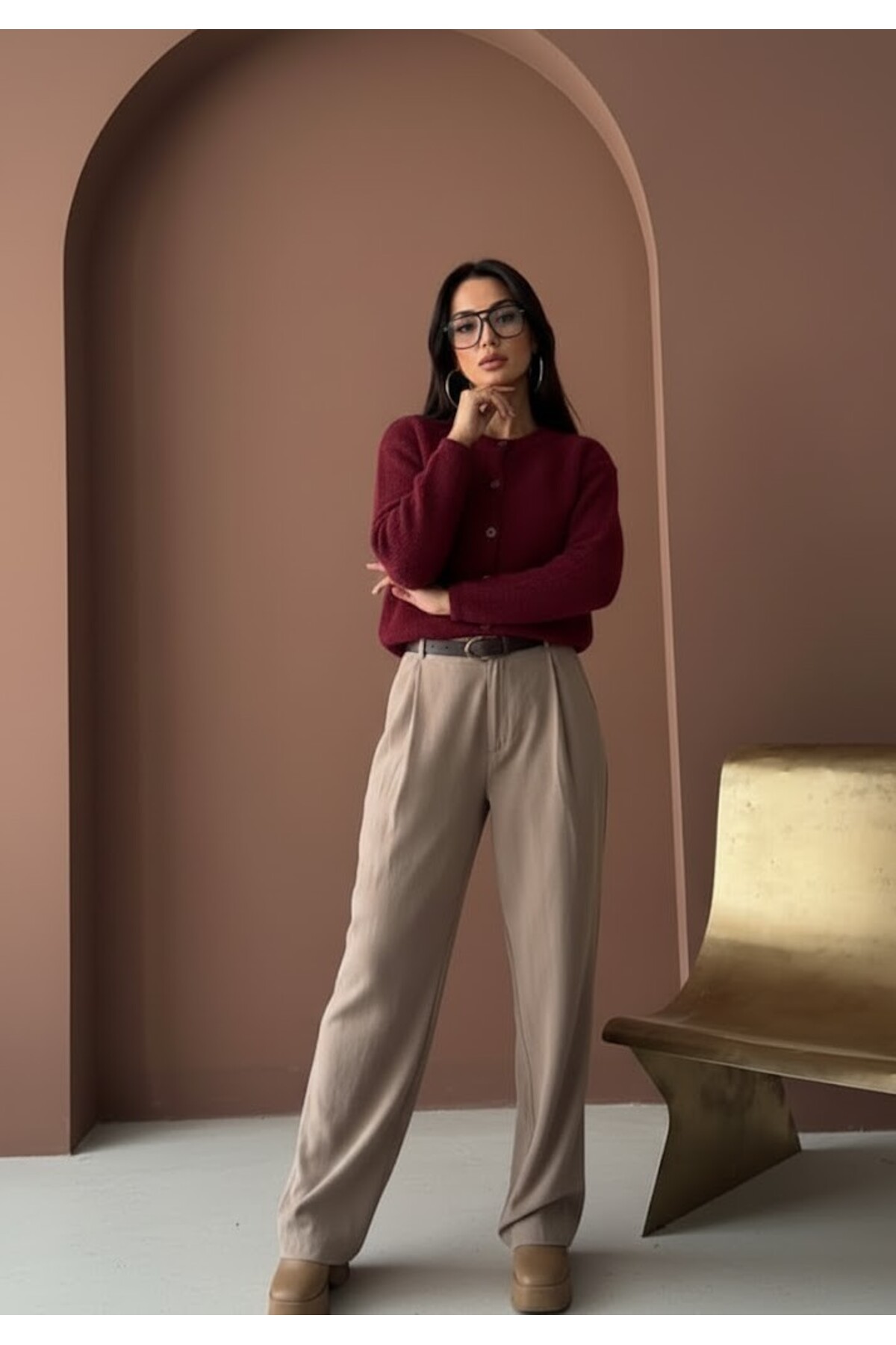 - Slim silueti ile modern ve şık bir duruş sergilerken, düğmeli kapama detayı pratik kullanım imkanı tanır.