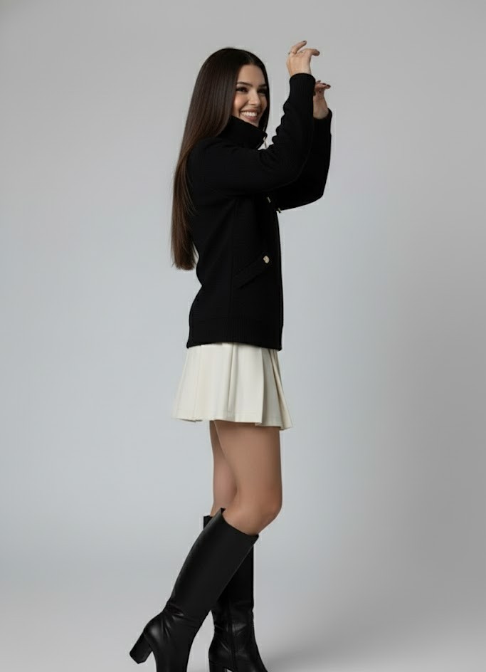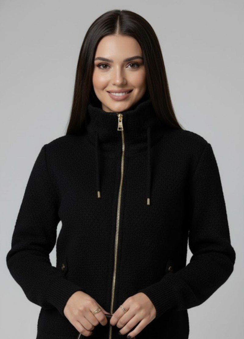 Modern kadın stilinin zarafetini konforla buluşturan bu dik yaka fermuarlı ceket, düz kesimi ve relax fit siluetiyle hem şık hem rahat bir görünüm sunar. Gündüz ofiste, akşam davetlerde veya şehirde konforlu şıklık sağlar.