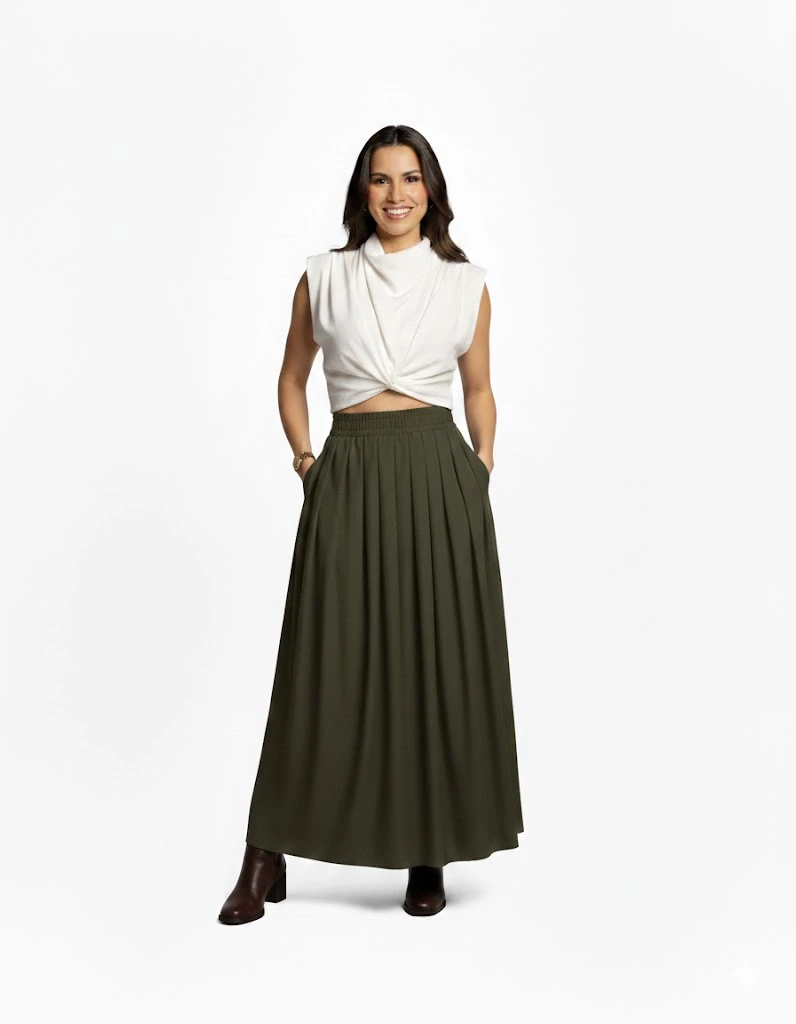 – Günlük kullanım için ideal, rahat ve şık bir tasarıma sahip.; – Poplin dokuma kumaşı ile hafif ve nefes alabilen bir yapı sunar.; – Çift cepli yapısı, küçük eşyalarınızı yanınızda taşımanız için pratik bir çözüm sağlar.; – Kemersiz tasarımı sayesinde farklı kombinler oluşturmanıza olanak tanır.; – Orta kalınlıkta kumaşı mevsim geçişlerinde ideal konforu sağlar.; – İlkbahar ve sonbahar mevsimleri için uygun, hafif ve serin tutan bir etek.; – Düz kesimi ve piliseli detayları ile feminen bir görünüm sunar.; – Beli lastikli yapısı sayesinde rahat bir kullanım ve mükemmel uyum sağlar.; – Astarsız ve düz desenli tasarımıyla sade ve zamansız bir şıklık yaratır.; – Bol kalıbı ve kloş silueti ile hareket özgürlüğü sunarken feminen bir duruş sergiler.; – Casual / günlük koleksiyonuna ait bu etek, ofis ortamında da rahatlıkla tercih edilebilir.; – Genç yaş grubuna hitap eden modern ve dinamik bir stil sunar.;