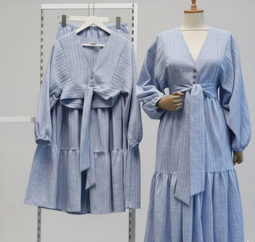 Zarafet ve konforun en tatlı hali! Hem açık hem de kapalı giyim kombinlerine uygun, çok yönlü kullanım avantajı sağlayan kurtarıcı parçanız.; " şık bağlama detayı ve katlı etek tasarımıyla bu takım stilinize hareket katacak.; ✨