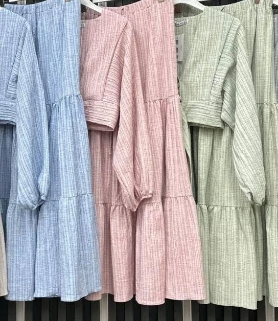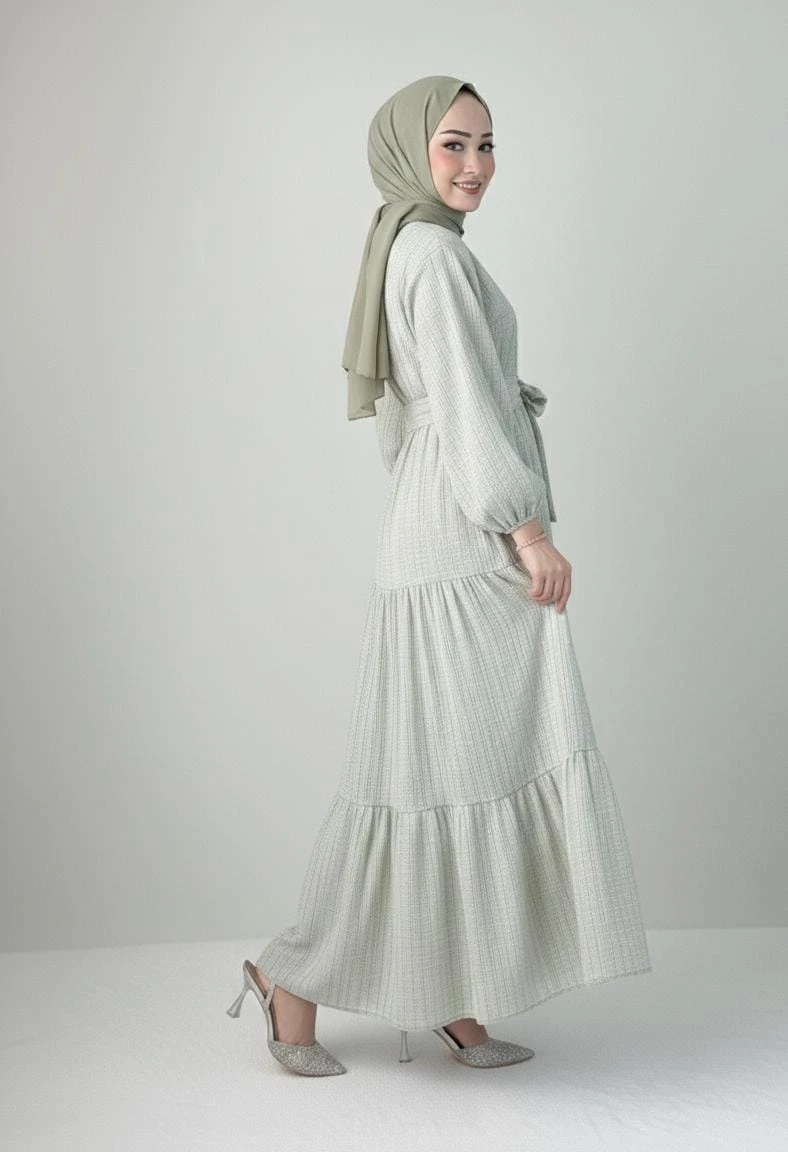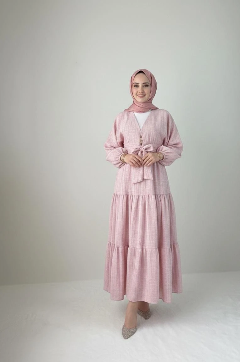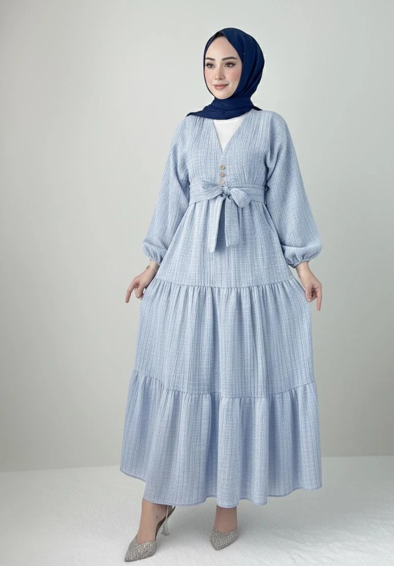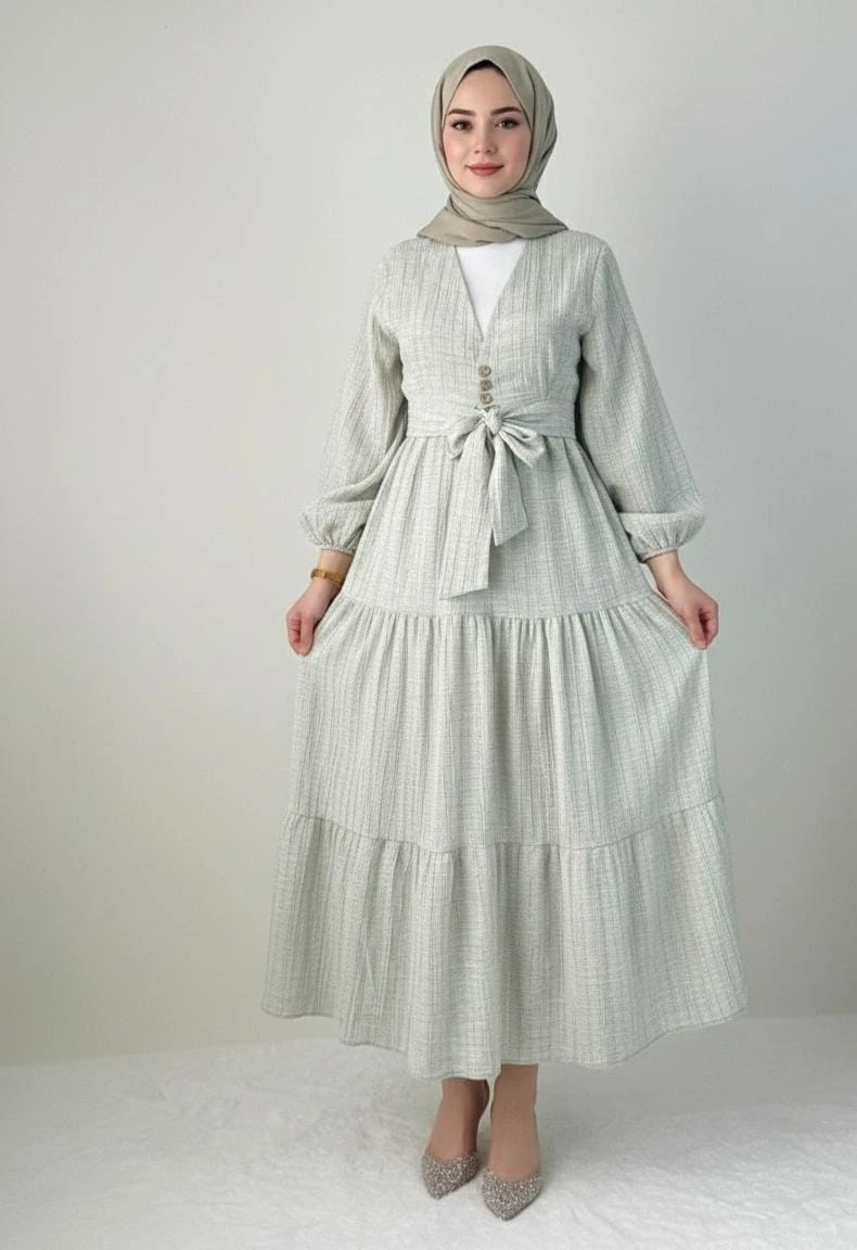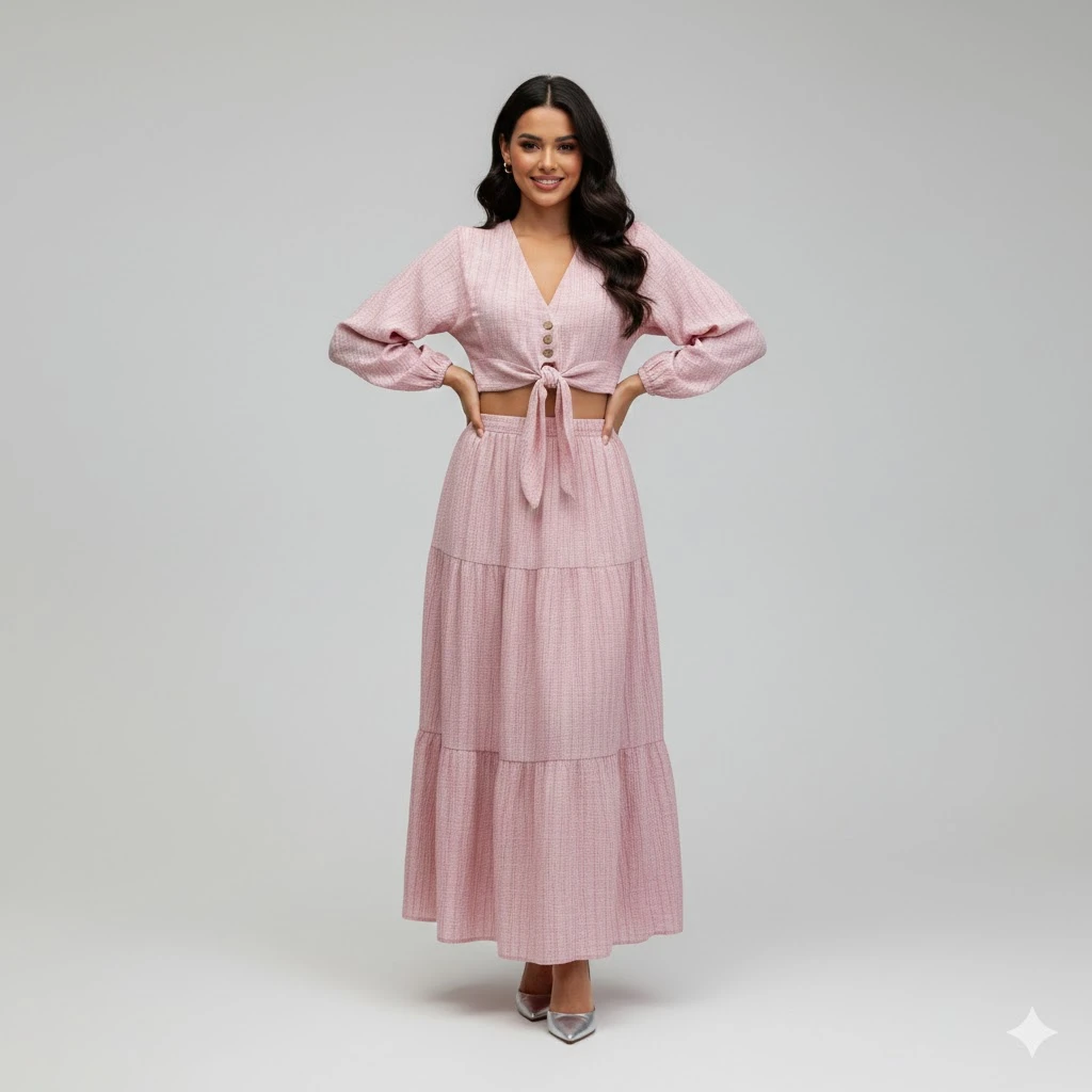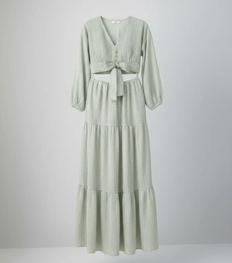 Zarafet ve konforun en tatlı hali! Hem açık hem de kapalı giyim kombinlerine uygun, çok yönlü kullanım avantajı sağlayan kurtarıcı parçanız.; ” şık bağlama detayı ve katlı etek tasarımıyla bu takım stilinize hareket katacak.; ✨
