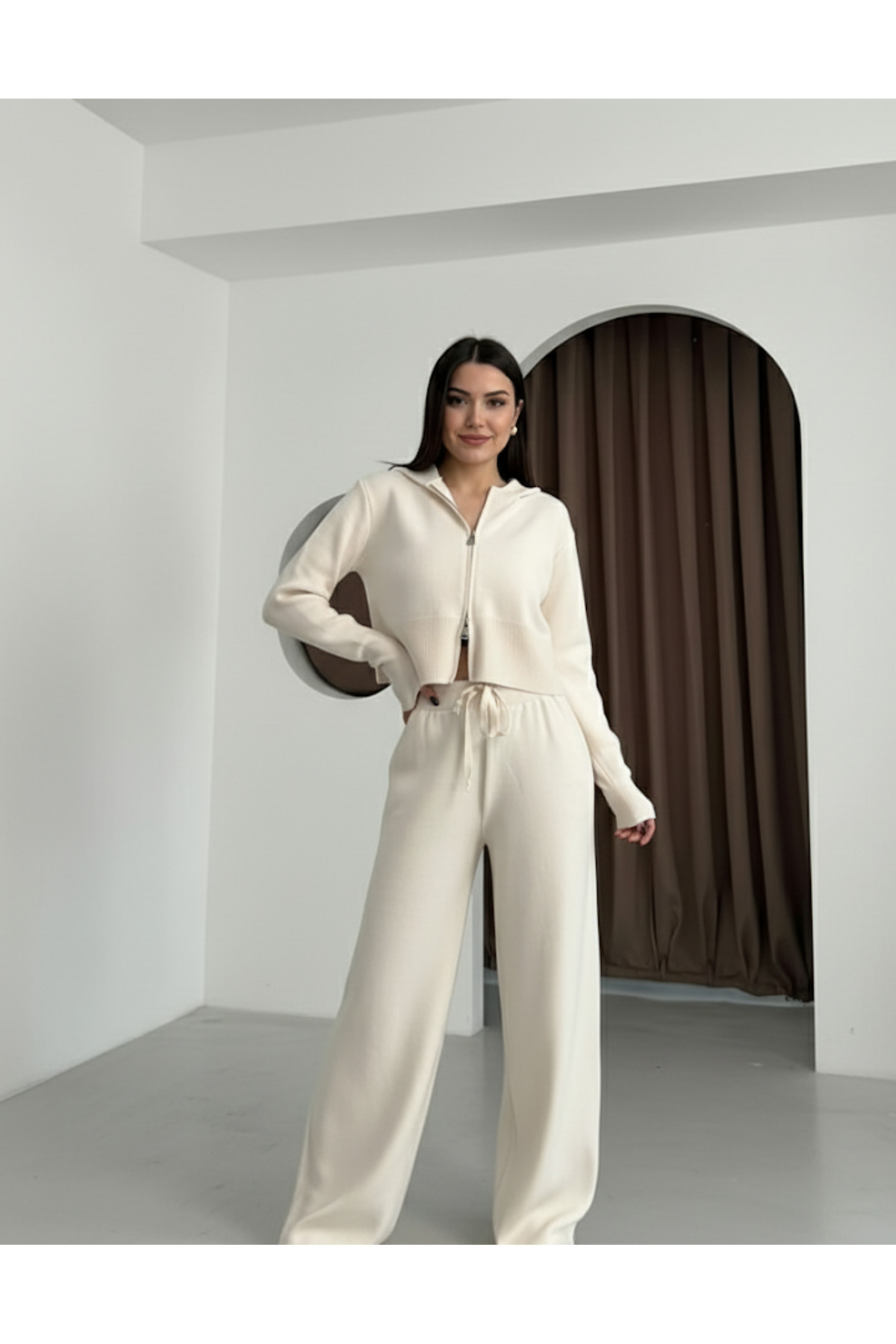 Rahatlığı ve şıklığı bir araya getiren Kapüşonlu Triko Takım, modern detaylarıyla dikkat çekiyor.